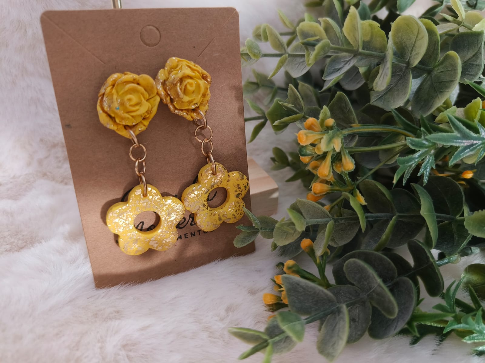 Los pendientes “Amarillo Floral” de Paula Monterior están elaborados a mano con arcilla polimérica, cuidando cada detalle para lograr una pieza ligera, cómoda y resistente. Su diseño combina una delicada rosa en la parte superior con una flor colgante de acabado brillante y destellos dorados, evocando la energía del sol y la belleza natural de la primavera.